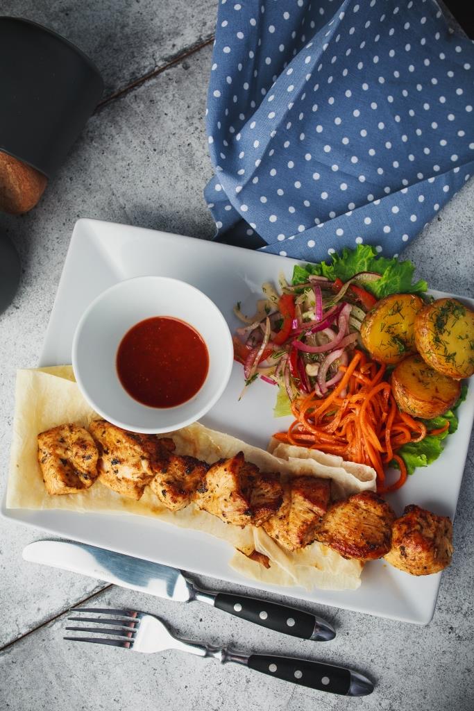 Шашлык из куриного филе, картофельные дольки, лаваш, соус сацебелли, салат с корейской морковью.
